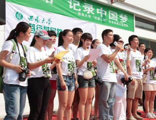 西南大學(xué)“傳媒之眼”社會(huì)實(shí)踐隊(duì)由新聞傳媒學(xué)院團(tuán)委老師李海峰、范曦帶隊(duì),8名研究生、19名本科生組成。團(tuán)隊(duì)圍繞“篤行基層路,記錄中國(guó)夢(mèng)”的主題,自7月3日開(kāi)始,從建設(shè)生態(tài)北碚、“百姓中國(guó)夢(mèng)”主題宣講、“幸福重慶”人文記錄、“山城百姓”社會(huì)調(diào)查四個(gè)方面開(kāi)展活動(dòng)。團(tuán)隊(duì)已經(jīng)在歇馬鎮(zhèn)碚青路中心廣場(chǎng)舉行了文藝匯演,并給群眾帶來(lái)了各種各樣的避暑藥品;到歇馬污水處理廠,了解當(dāng)?shù)厣a(chǎn)生活污水的處理;到重慶歇馬機(jī)械曲軸有限公司,宣傳“節(jié)能生產(chǎn)”理念,在員工中開(kāi)展環(huán)保培訓(xùn),強(qiáng)調(diào)可持續(xù)生產(chǎn)和發(fā)展。