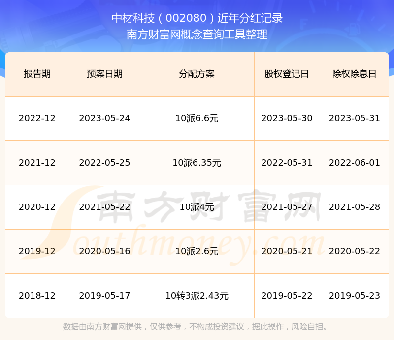 中材科技最新一次公布的分紅方案為10派6.6元。本次權(quán)益分派股權(quán)登記日為2023年5月30日,除權(quán)除息日為2023年5月31日,派息日為2023年5月31日。
