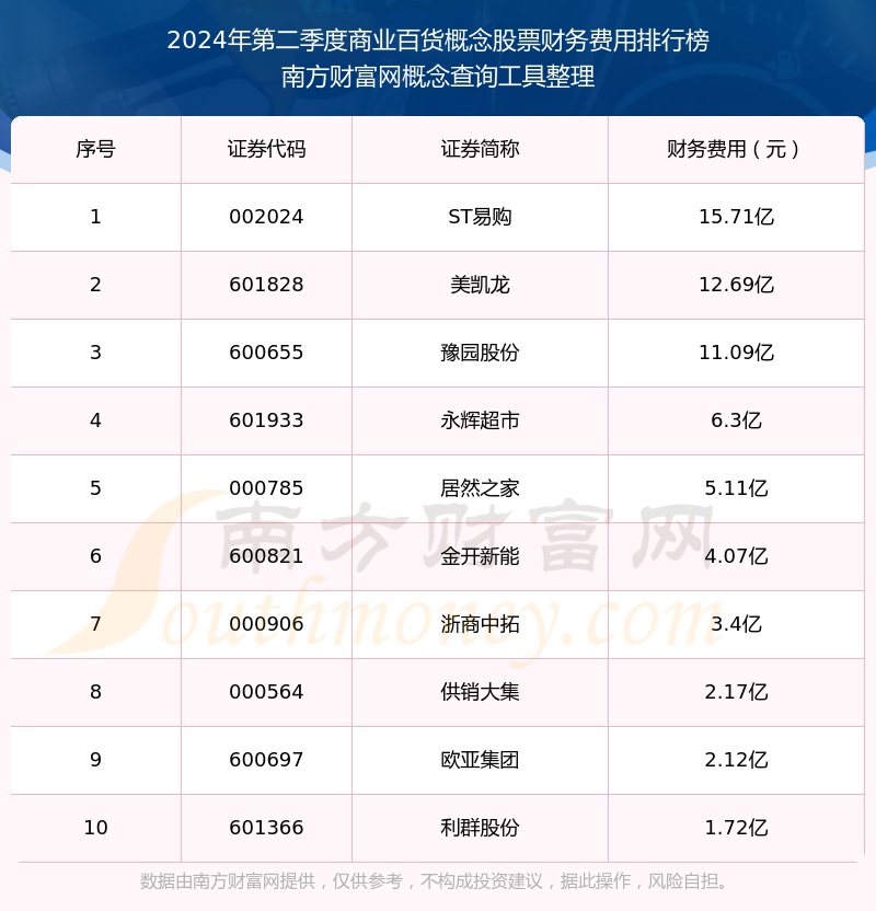 2024年第二季度商業(yè)百貨概念股票財務(wù)費(fèi)用排行榜如下:ST易購(002024)的財務(wù)費(fèi)用總額高達(dá)15.71億,美凱龍(601828)和豫園股份(600655)分別位居第二和第三,永輝超市(601933)、居然之家(000785)、金開新能(600821)、浙商中拓(000906)、供銷大集(000564)、歐亞集團(tuán)(600697)、利群股份(601366)分別進(jìn)入前十,其財務(wù)費(fèi)用總額分別排名第4-10名。
