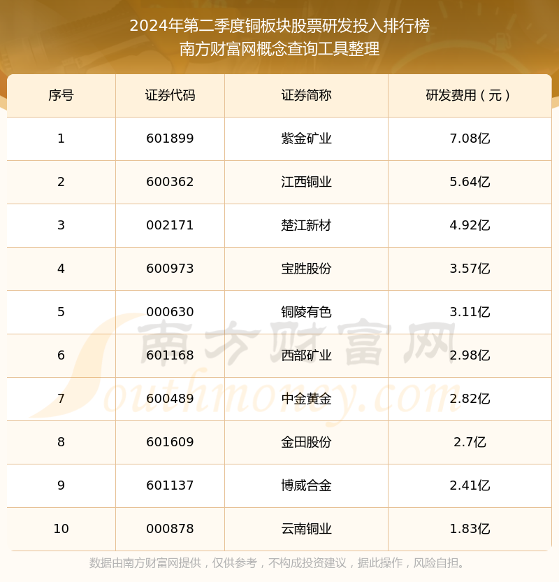 2024年第二季度銅板塊股票研發(fā)投入排行榜如下:紫金礦業(yè)(601899)研發(fā)投入總額高達(dá)7.08億,江西銅業(yè)(600362)和楚江新材(002171)分別位居第二和第三,寶勝股份(600973)、銅陵有色(000630)、西部礦業(yè)(601168)、中金黃金(600489)、金田股份(601609)、博威合金(601137)、云南銅業(yè)(000878)分別進(jìn)入前十,其研發(fā)投入總額分別排名第4-10名。