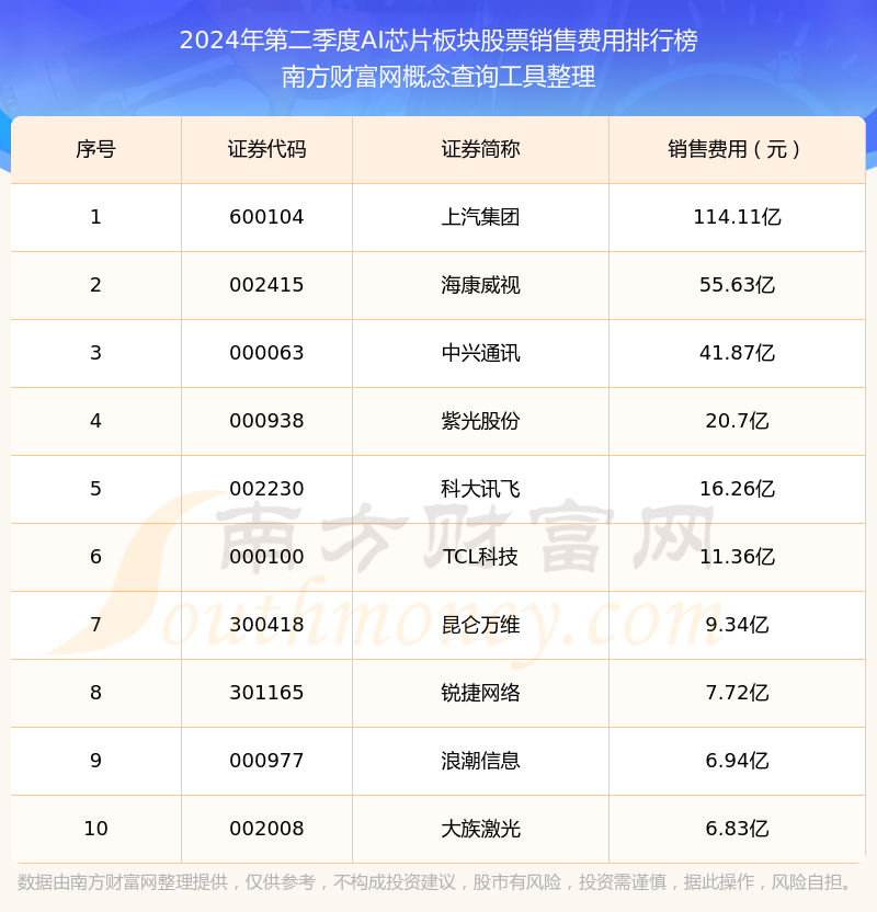 2024年第二季度,AI芯片板塊股票銷售費用排行榜如下:上汽集團(600104)的銷售費用總額高達114.11億,海康威視(002415)和中興通訊(000063)分別位居第二和第三,紫光股份(000938)、科大訊飛(002230)、TCL科技(000100)、昆侖萬維(300418)、銳捷網(wǎng)絡(luò)(301165)、浪潮信息(000977)、大族激光(002008)分別進入前十,其銷售費用總額分別排名第4-10名。