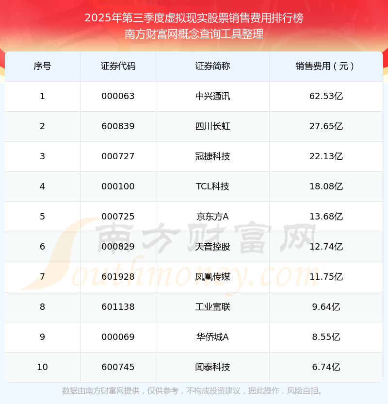 2025年第三季度,虛擬現(xiàn)實(shí)股票銷售費(fèi)用排名中,中興通訊(000063)銷售費(fèi)用總額高達(dá)62.53億,四川長(zhǎng)虹(600839)和冠捷科技(000727)排名第二和第三,TCL科技(000100)、京東方A(000725)、天音控股(000829)、鳳凰傳媒(601928)、工業(yè)富聯(lián)(601138)、華僑城A(000069)、聞泰科技(600745)進(jìn)入前十,銷售費(fèi)用總額分別排名第4-10名。