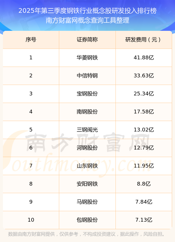 2025年第三季度鋼鐵行業(yè)概念股研發(fā)投入排行榜如下:華菱鋼鐵(000932)研發(fā)投入總額高達(dá)41.88億,中信特鋼(000708)和寶鋼股份(600019)分別排名第二和第三,南鋼股份(600282)、三鋼閩光(002110)、河鋼股份(000709)、山東鋼鐵(600022)、安陽鋼鐵(600569)、馬鋼股份(600808)、包鋼股份(600010)分別進(jìn)入前十,其研發(fā)投入總額分別排名第4-10名。