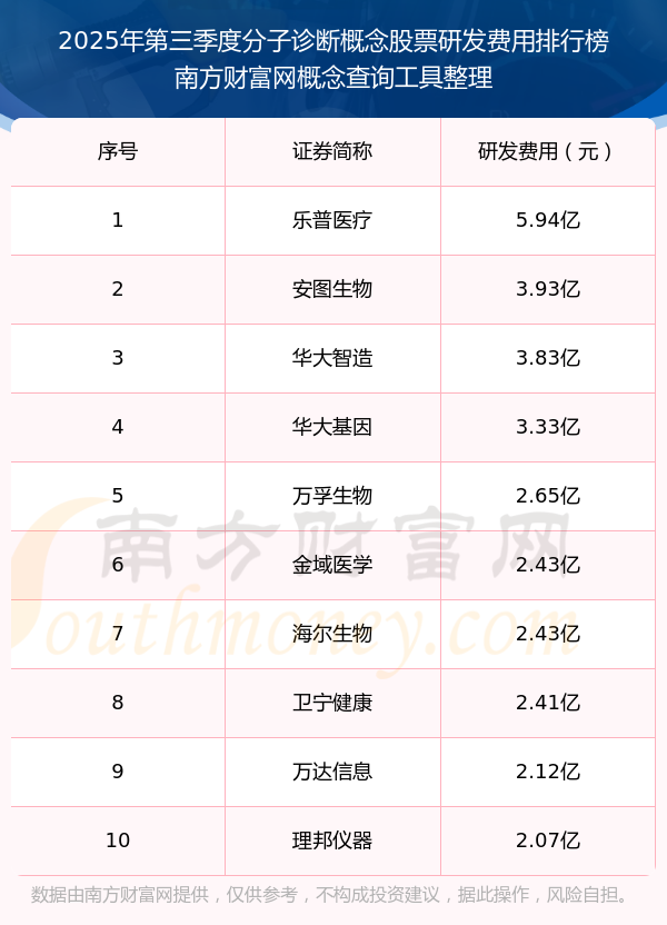 2025年第三季度,分子診斷概念股票研發(fā)費用排行榜中,樂普醫(yī)療(300003)研發(fā)費用總額高達5.94億,安圖生物(603658)和華大智造(688114)位居第二和第三,華大基因(300676)、萬孚生物(300482)、金域醫(yī)學(xué)(603882)、海爾生物(688139)、衛(wèi)寧健康(300253)、萬達信息(300168)、理邦儀器(300206)進入前十,研發(fā)費用總額分別排名第4-10名。
