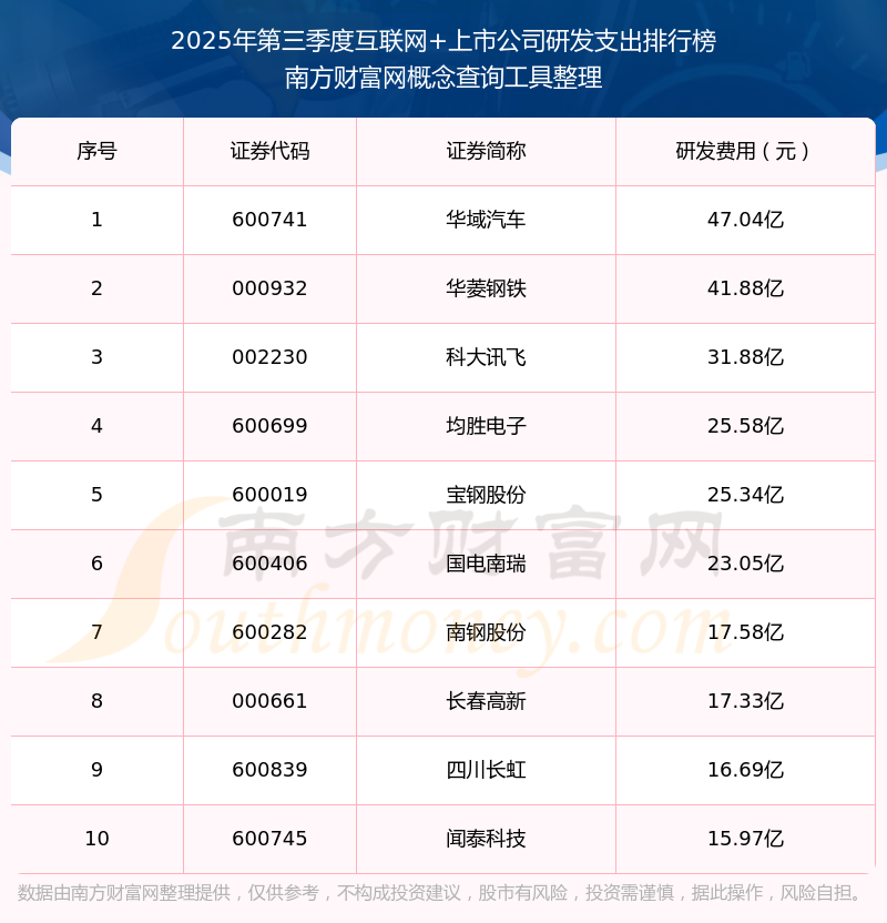 2025年第三季度,互聯(lián)網(wǎng)+上市公司研發(fā)支出排名如下:華域汽車(600741)研發(fā)支出總額高達47.04億,華菱鋼鐵(000932)和科大訊飛(002230)分別位居第二和第三,均勝電子(600699)、寶鋼股份(600019)、國電南瑞(600406)、南鋼股份(600282)、長春高新(000661)、四川長虹(600839)、聞泰科技(600745)分別進入前十,其研發(fā)支出總額分別排名第4-10名。