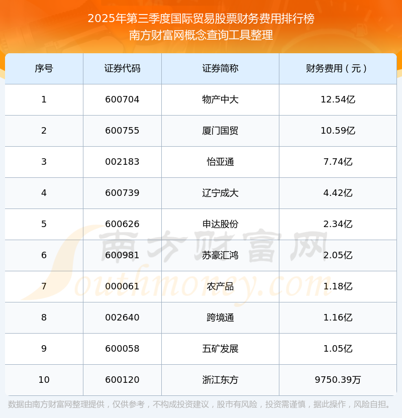 2025年第三季度,國際貿(mào)易股票財務費用排名如下:物產(chǎn)中大(600704)的財務費用總額高達12.54億,廈門國貿(mào)(600755)和怡亞通(002183)分別位居第二和第三,遼寧成大(600739)、申達股份(600626)、蘇豪匯鴻(600981)、農(nóng)產(chǎn)品(000061)、跨境通(002640)、五礦發(fā)展(600058)、浙江東方(600120)分別進入前十,其財務費用總額分別排名第4-10名。
