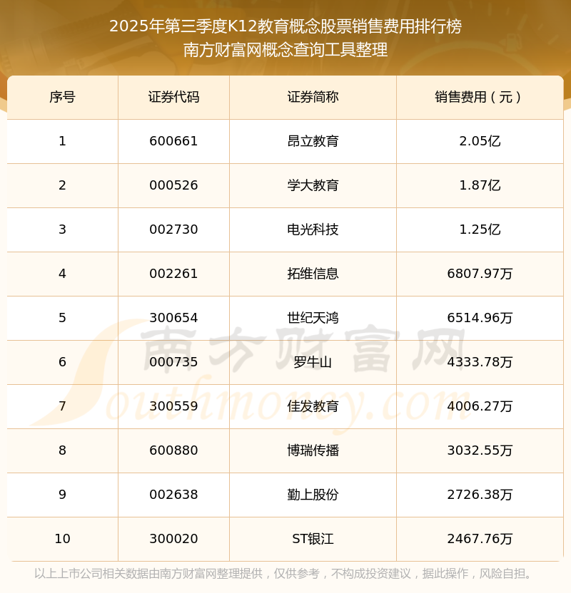 2025年第三季度,K12教育概念股票銷售費(fèi)用排名中,昂立教育(600661)銷售費(fèi)用總額高達(dá)2.05億,學(xué)大教育(000526)和電光科技(002730)排名第二和第三,拓維信息(002261)、世紀(jì)天鴻(300654)、羅牛山(000735)、佳發(fā)教育(300559)、博瑞傳播(600880)、勤上股份(002638)、ST銀江(300020)進(jìn)入前十,銷售費(fèi)用總額分別排名第4-10名。