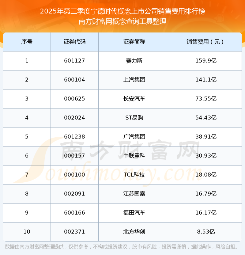 2025年第三季度,寧德時(shí)代概念上市公司銷(xiāo)售費(fèi)用排行榜如下:賽力斯(601127)的銷(xiāo)售費(fèi)用總額高達(dá)159.9億,上汽集團(tuán)(600104)和長(zhǎng)安汽車(chē)(000625)分別位居第二和第三,ST易購(gòu)(002024)、廣汽集團(tuán)(601238)、中聯(lián)重科(000157)、TCL科技(000100)、江蘇國(guó)泰(002091)、福田汽車(chē)(600166)、北方華創(chuàng)(002371)分別進(jìn)入前十,其銷(xiāo)售費(fèi)用總額分別排名第4-10名。