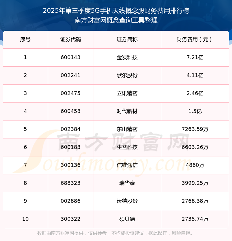 2025年第三季度5G手機(jī)天線概念股財(cái)務(wù)費(fèi)用排行榜如下:金發(fā)科技(600143)的財(cái)務(wù)費(fèi)用總額高達(dá)7.21億,歌爾股份(002241)和立訊精密(002475)分別位居第二和第三,時(shí)代新材(600458)、東山精密(002384)、生益科技(600183)、信維通信(300136)、瑞華泰(688323)、沃特股份(002886)、碩貝德(300322)分別進(jìn)入前十,其財(cái)務(wù)費(fèi)用總額分別排名第4-10名。