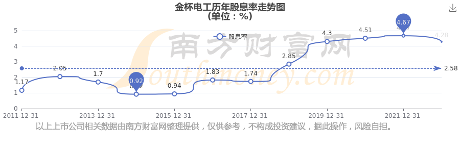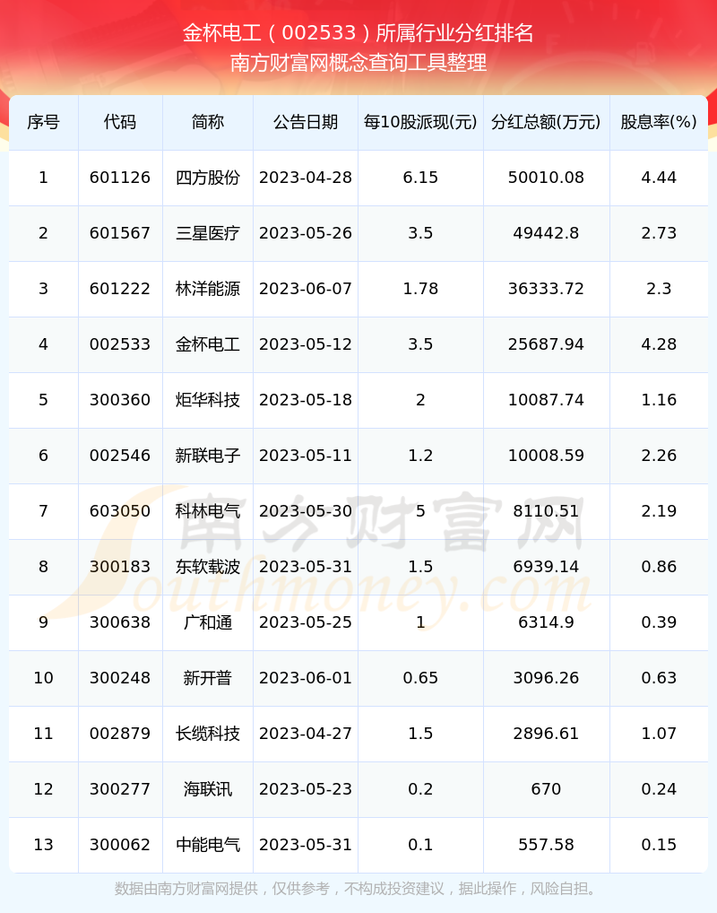 按照南方財富網趨勢選股系統(tǒng)統(tǒng)計,金杯電工所屬行業(yè)為電線電纜行業(yè),電線電纜行業(yè)分紅排名情況如下表: