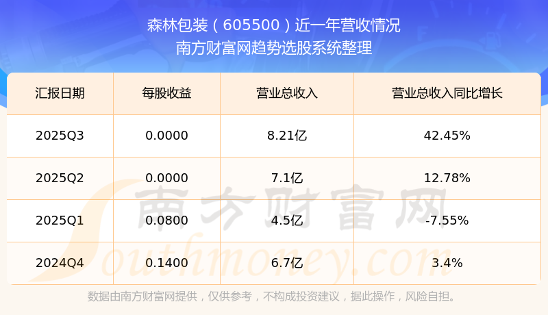 森林包裝2025年第三季度公司實現(xiàn)營業(yè)收入8.21億元,同比42.45%;歸母凈利潤-91.57萬元,同比-101.65%。