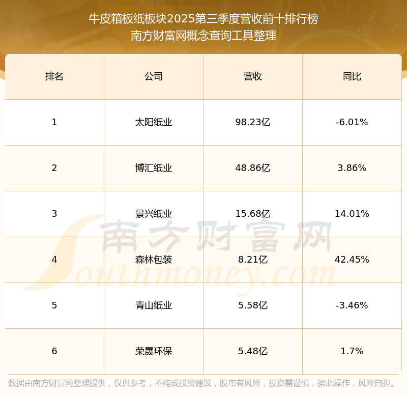 按照南方財富網(wǎng)概念查詢工具統(tǒng)計,該股所屬板塊為牛皮箱板紙板塊,該板塊共有6只股票,森林包裝2025第三季度營收在該板塊中排名為第4名,該板塊2025第三季度營收排名前十的股票如下表: