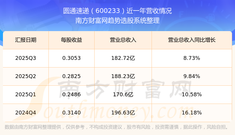 財(cái)報(bào)顯示,2025年第三季度圓通速遞營收182.72億元,同比增長8.73%,凈利潤10.46億元,同比增長10.97%。