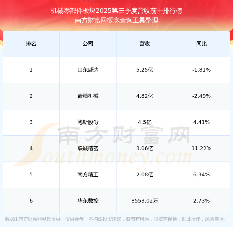 按照南方財富網(wǎng)概念查詢工具統(tǒng)計,該股所屬板塊為機械零部件板塊,該板塊共有6只股票,華翔股份2025第三季度營收在該板塊中排名為第6名,該板塊2025第三季度營收排名前十的股票如下表: