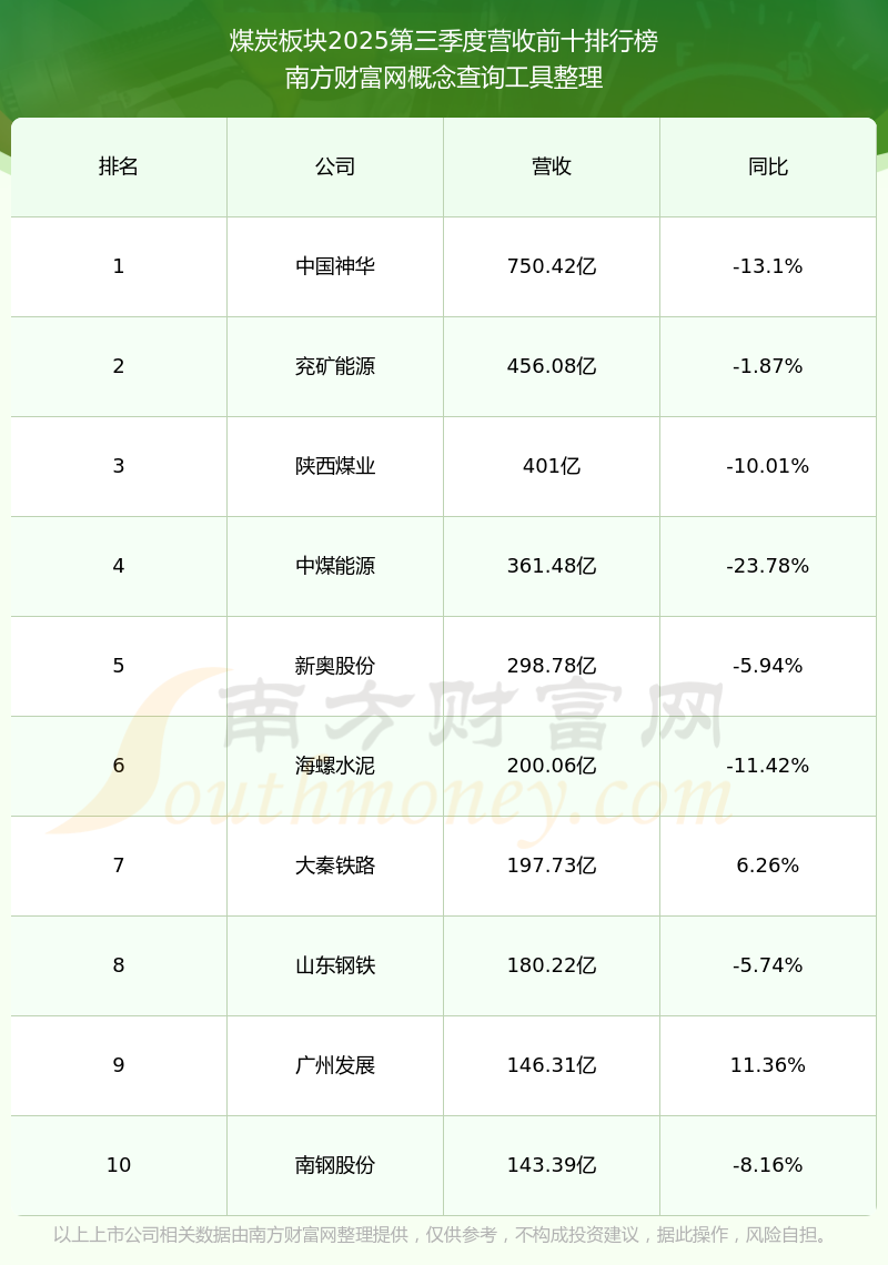 按照南方財(cái)富網(wǎng)概念查詢工具統(tǒng)計(jì),該股所屬板塊為煤炭板塊,該板塊共有72只股票,瑞茂通2025第三季度營(yíng)收在該板塊中排名為第72名,該板塊2025第三季度營(yíng)收排名前十的股票如下表: