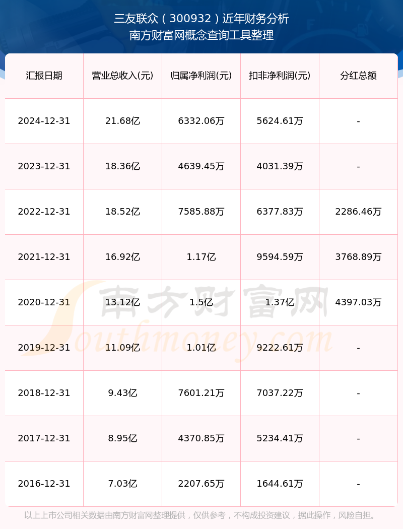 三友聯(lián)眾最新一次公布的分紅方案為10派1.3元。本次權(quán)益分派股權(quán)登記日為2023年6月8日,除權(quán)除息日為2023年6月9日,派息日為2023年6月9日。 公司2024年實現(xiàn)營業(yè)收入21.68億元,同比增長