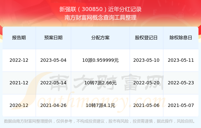 新強(qiáng)聯(lián)最新一次公布的分紅方案為10派0.959999元。本次權(quán)益分派股權(quán)登記日為2023年5月10日,除權(quán)除息日為2023年5月11日,派息日為2023年5月11日。