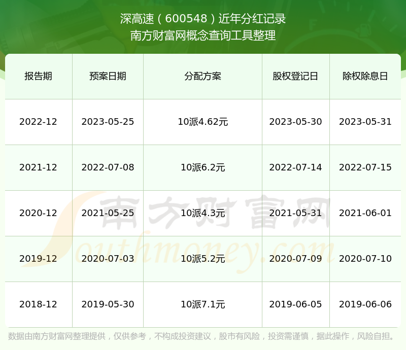 深高速最新一次公布的分紅方案為10派4.62元。本次權(quán)益分派股權(quán)登記日為2023年5月30日,除權(quán)除息日為2023年5月31日,派息日為2023年5月31日。