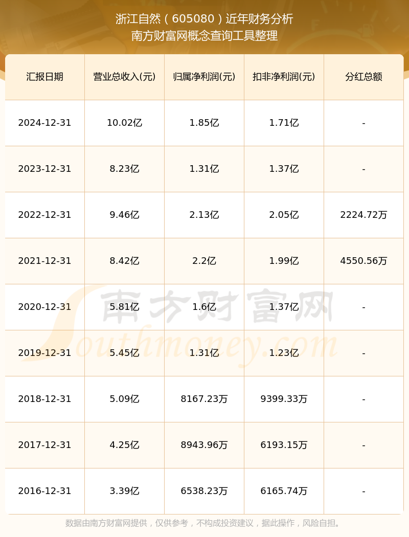 浙江自然公司2024年實現(xiàn)營業(yè)收入10.02億元,同比增長21.75%;凈利潤1.85億元,同比增長41.67%;毛利率33.72%。