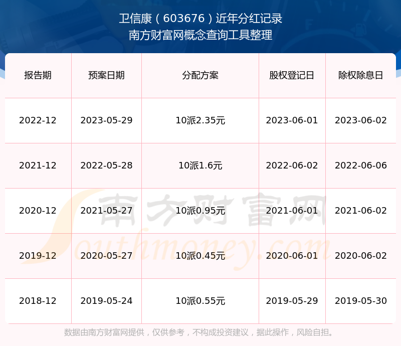 近年衛(wèi)信康分紅派息情況如下表所示: