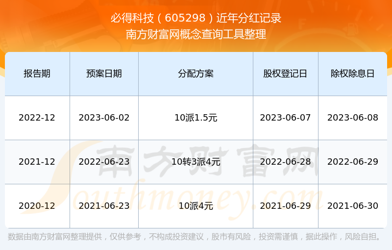 必得科技最新一次公布的分紅方案為10派1.5元。本次權(quán)益分派股權(quán)登記日為2023年6月7日,除權(quán)除息日為2023年6月8日,派息日為2023年6月8日。