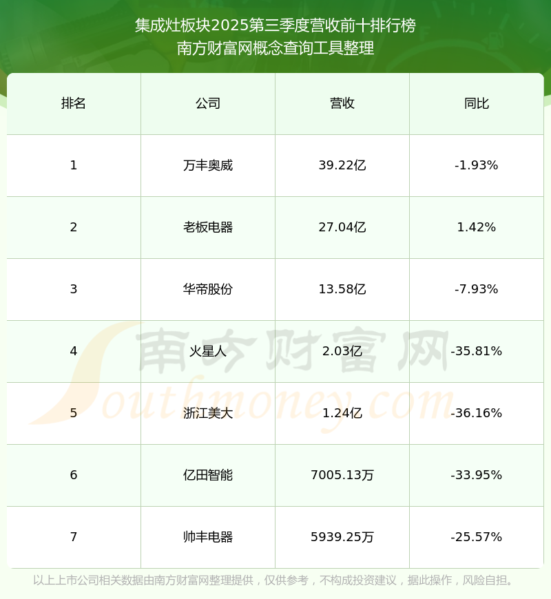 按照南方財富網(wǎng)概念查詢工具統(tǒng)計,該股所屬板塊為集成灶板塊,該板塊共有7只股票,帥豐電器2025第三季度營收在該板塊中排名為第7名,該板塊2025第三季度營收排名前十的股票如下表: