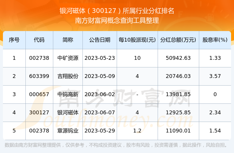 按照南方財富網(wǎng)趨勢選股系統(tǒng)統(tǒng)計,銀河磁體所屬行業(yè)為小金屬行業(yè),小金屬行業(yè)分紅排名情況如下表: