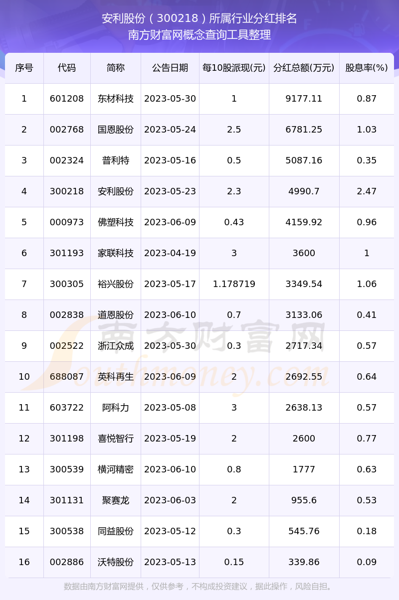 按照南方財(cái)富網(wǎng)趨勢(shì)選股系統(tǒng)統(tǒng)計(jì),安利股份所屬行業(yè)為合成革行業(yè),合成革行業(yè)分紅排名情況如下表: