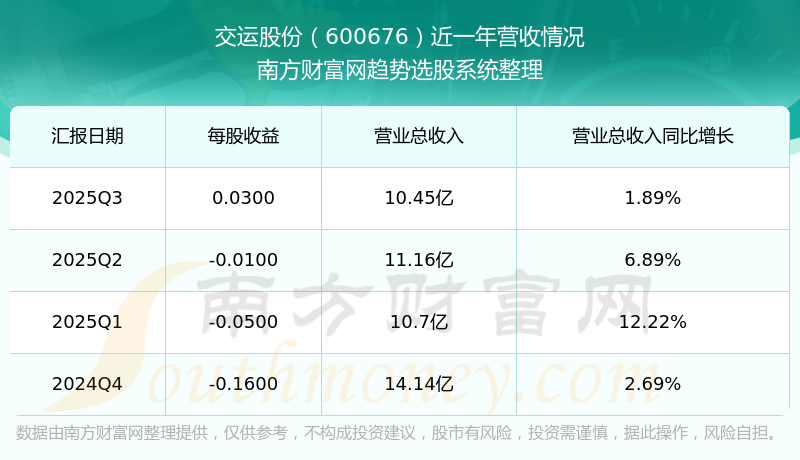 按照南方財(cái)富網(wǎng)概念查詢工具統(tǒng)計(jì),該股所屬板塊為冷鏈物流板塊,該板塊共有146只股票,交運(yùn)股份2025第三季度營收在該板塊中排名為第80名,該板塊2025第三季度營收排名前十的股票如下表: