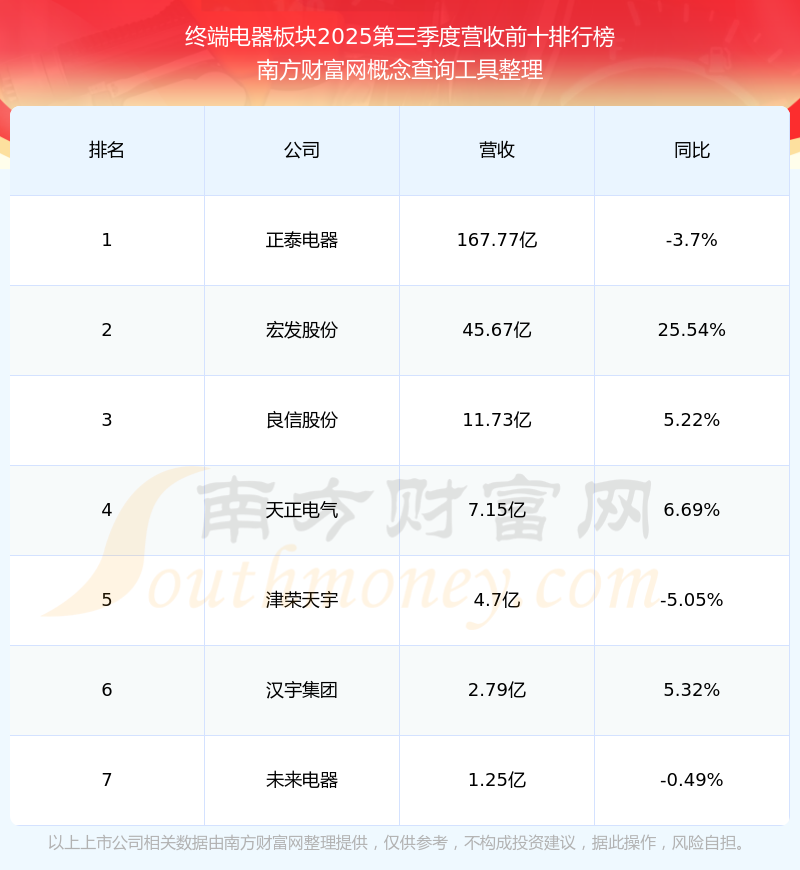 按照南方財(cái)富網(wǎng)概念查詢工具統(tǒng)計(jì),該股所屬板塊為終端電器板塊,該板塊共有7只股票,天正電氣2025第三季度營收在該板塊中排名為第4名,該板塊2025第三季度營收排名前十的股票如下表: