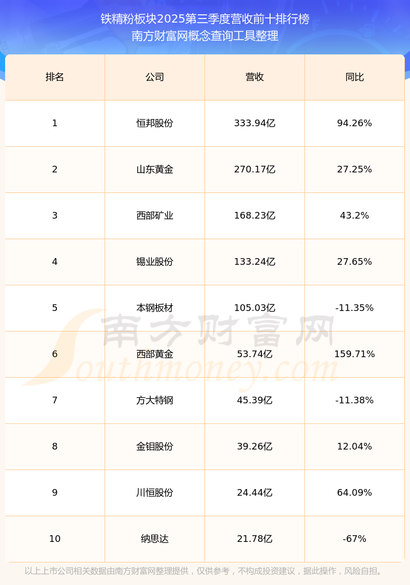 按照南方財(cái)富網(wǎng)概念查詢工具統(tǒng)計(jì),該股所屬板塊為鐵精粉板塊,該板塊共有32只股票,方大炭素2025第三季度營(yíng)收在該板塊中排名為第18名,該板塊2025第三季度營(yíng)收排名前十的股票如下表: