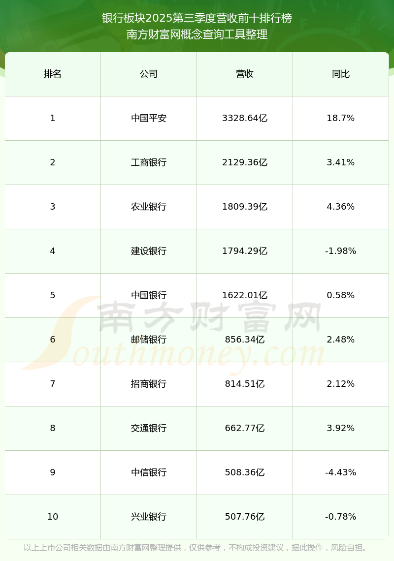 按照南方財富網(wǎng)概念查詢工具統(tǒng)計,該股所屬板塊為銀行板塊,該板塊共有44只股票,中信銀行2025第三季度營收在該板塊中排名為第9名,該板塊2025第三季度營收排名前十的股票如下表: