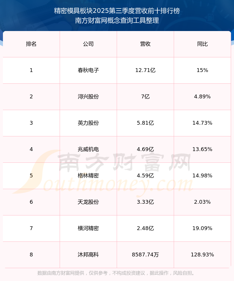 按照南方財(cái)富網(wǎng)概念查詢工具統(tǒng)計(jì),該股所屬板塊為精密模具板塊,該板塊共有8只股票,天龍股份2025第三季度營收在該板塊中排名為第6名,該板塊2025第三季度營收排名前十的股票如下表: