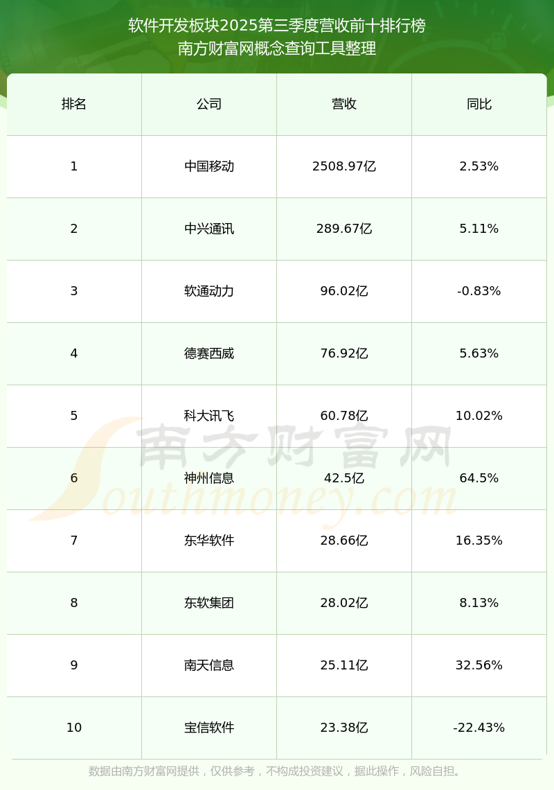 按照南方財富網(wǎng)概念查詢工具統(tǒng)計,該股所屬板塊為軟件開發(fā)板塊,該板塊共有195只股票,中科星圖2025第三季度營收在該板塊中排名為第195名,該板塊2025第三季度營收排名前十的股票如下表: