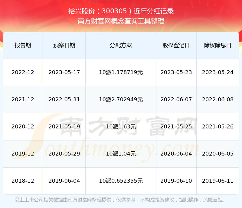 裕興股份最新一次公布的分紅方案為10派1.178719元。本次權(quán)益分派股權(quán)登記日為2023年5月23日,除權(quán)除息日為2023年5月24日,派息日為2023年5月24日。