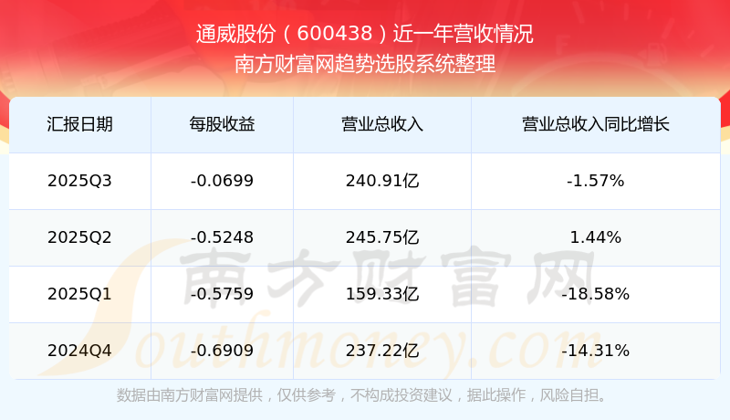 財報顯示,2025年第三季度通威股份營收240.91億元,同比增長-1.57%,凈利潤-3.15億元,同比增長62.69%。