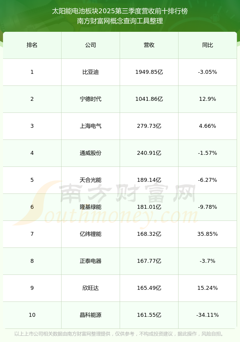 按照南方財富網(wǎng)概念查詢工具統(tǒng)計,該股所屬板塊為太陽能電池板塊,該板塊共有95只股票,通威股份2025第三季度營收在該板塊中排名為第4名,該板塊2025第三季度營收排名前十的股票如下表: