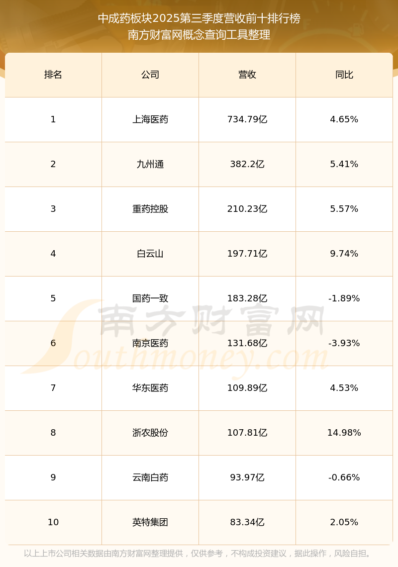 按照南方財(cái)富網(wǎng)概念查詢工具統(tǒng)計(jì),該股所屬板塊為中成藥板塊,該板塊共有105只股票,步長(zhǎng)制藥2025第三季度營(yíng)收在該板塊中排名為第20名,該板塊2025第三季度營(yíng)收排名前十的股票如下表: