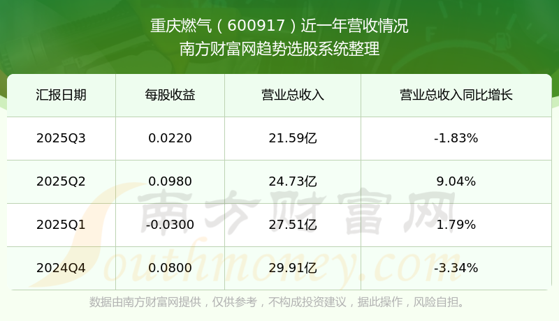 重慶燃氣2025年第三季度顯示,公司主營收入21.59億元,同比-1.83%;歸母凈利潤3446.67萬元,同比-70.38%;扣非凈利潤2899.57萬元,同比-75.73%;