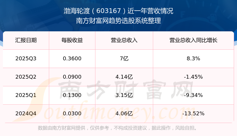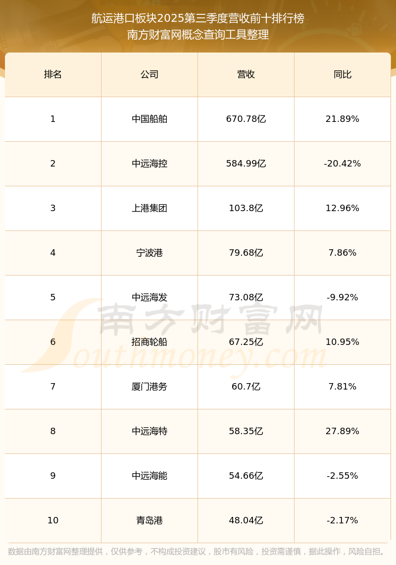 按照南方財(cái)富網(wǎng)概念查詢工具統(tǒng)計(jì),該股所屬板塊為航運(yùn)港口板塊,該板塊共有40只股票,渤海輪渡2025第三季度營(yíng)收在該板塊中排名為第30名,該板塊2025第三季度營(yíng)收排名前十的股票如下表: