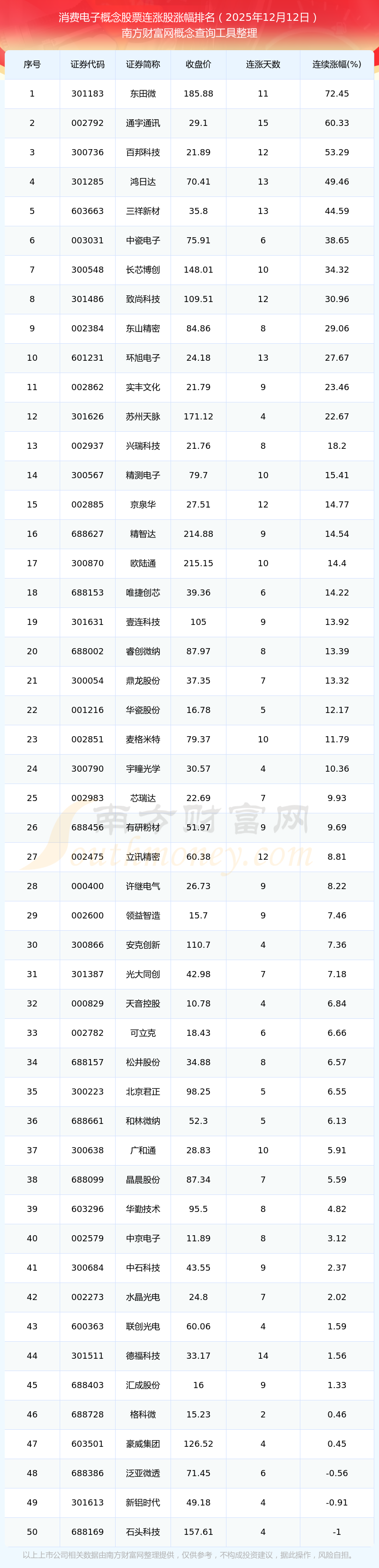 根據(jù)南方財富網(wǎng)概念查詢工具數(shù)據(jù)統(tǒng)計,截止2025年12月12日收盤,消費電子概念股票共有88只個股實現(xiàn)連漲。其中連續(xù)漲幅較大的個股有東田微、通宇通訊、百邦科技等,連續(xù)漲幅分別為72.45%、60.33%、53.29%。