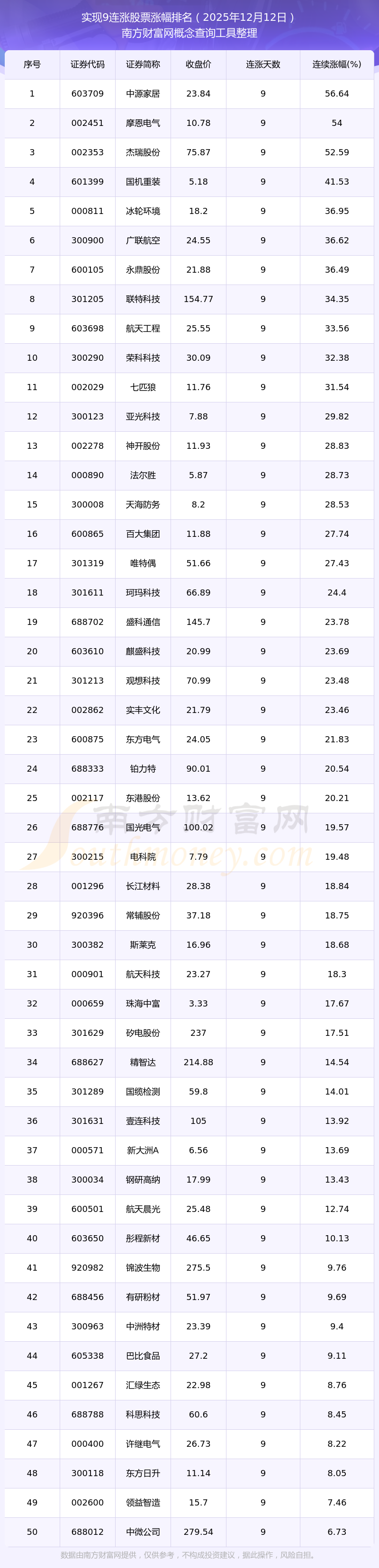 根據(jù)南方財(cái)富網(wǎng)概念查詢工具數(shù)據(jù)統(tǒng)計(jì),截止2025年12月12日收盤,共有74只個(gè)股實(shí)現(xiàn)9天連漲。其中連續(xù)漲幅較大的個(gè)股有中源家居、摩恩電氣、杰瑞股份等,連續(xù)漲幅分別為56.64%、54.00%、52.59%。