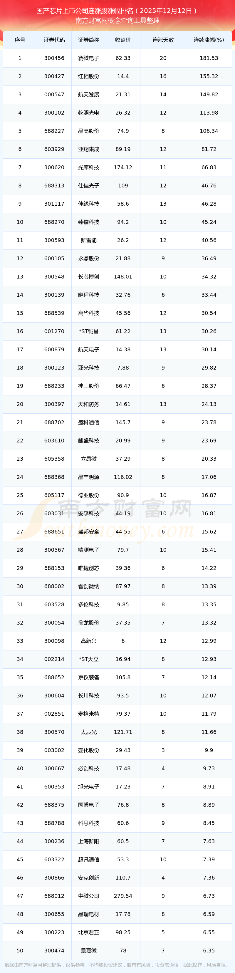 2025年12月12日國產(chǎn)芯片上市公司連漲股漲幅排名