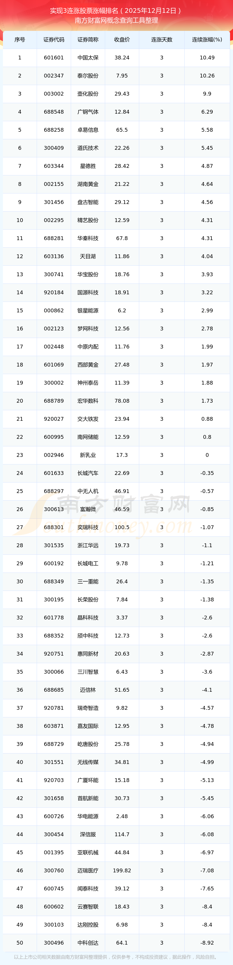 根據(jù)南方財富網(wǎng)概念查詢工具數(shù)據(jù)統(tǒng)計,截止2025年12月12日收盤,共有62只個股實現(xiàn)3天連漲。其中連續(xù)漲幅較大的個股有中國太保、泰爾股份、壺化股份等,連續(xù)漲幅分別為10.49%、10.26%、9.90%。