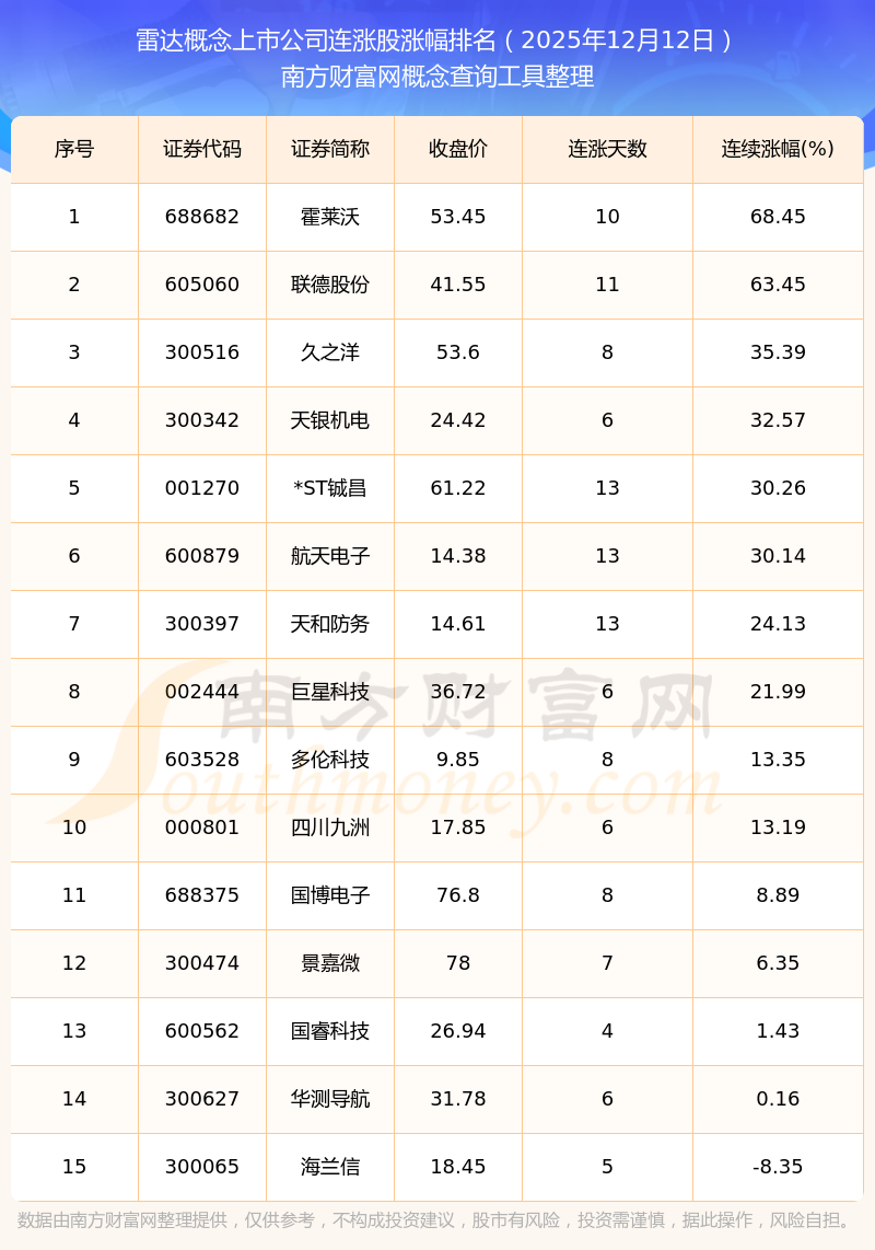 2025年12月12日雷達(dá)概念上市公司連漲股漲幅排名