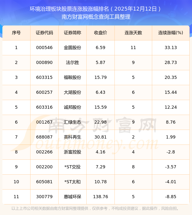 根據(jù)南方財富網(wǎng)概念查詢工具數(shù)據(jù)統(tǒng)計,截止2025年12月12日收盤,環(huán)境治理板塊股票共有11只個股實現(xiàn)連漲。其中連續(xù)漲幅較大的個股有金圓股份、法爾勝、福鞍股份等,連續(xù)漲幅分別為33.13%、28.73%、20.35%。