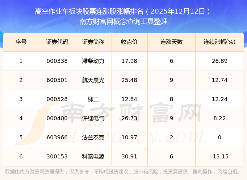 根據(jù)南方財富網概念查詢工具數(shù)據(jù)統(tǒng)計,截止2025年12月12日收盤,高空作業(yè)車板塊股票共有6只個股實現(xiàn)連漲。其中連續(xù)漲幅較大的個股有濰柴動力、航天晨光、柳工等,連續(xù)漲幅分別為26.89%、12.74%、12.24%。