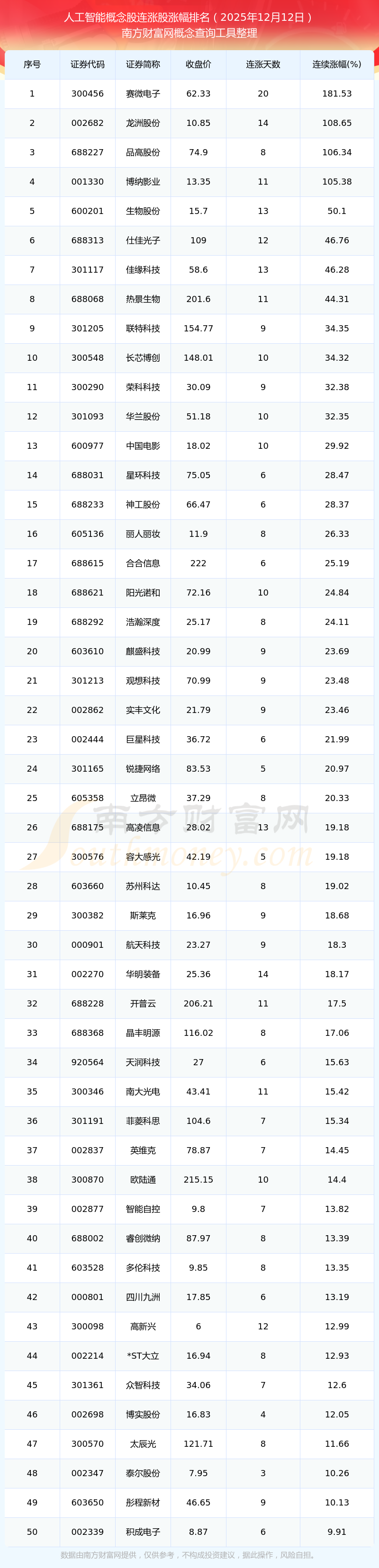 根據(jù)南方財富網(wǎng)概念查詢工具數(shù)據(jù)統(tǒng)計,截止2025年12月12日收盤,人工智能概念股共有176只個股實現(xiàn)連漲。其中連續(xù)漲幅較大的個股有賽微電子、龍洲股份、品高股份等,連續(xù)漲幅分別為181.53%、108.65%、106.34%。