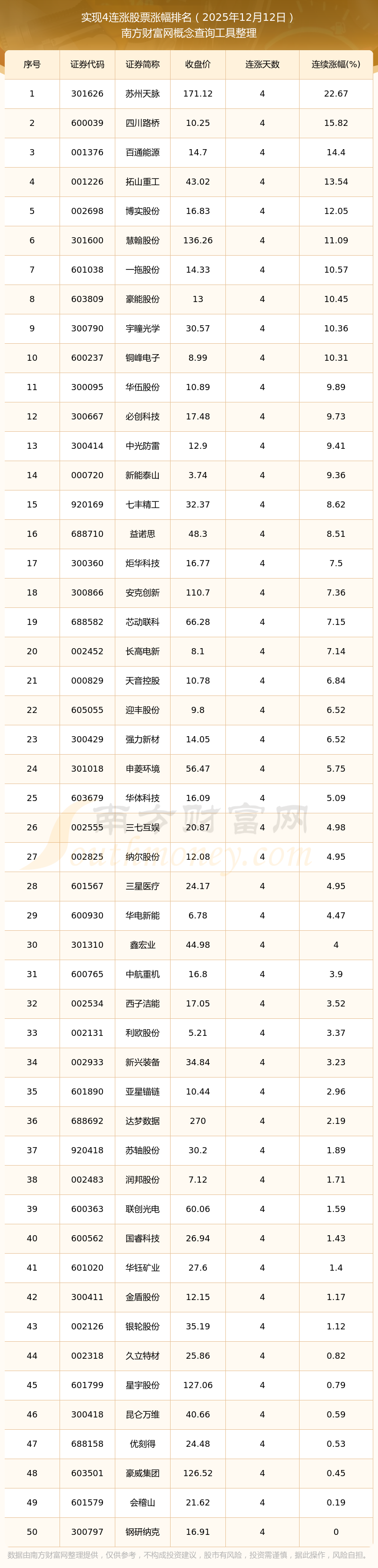 2025年12月12日實(shí)現(xiàn)4連漲股票漲幅排名