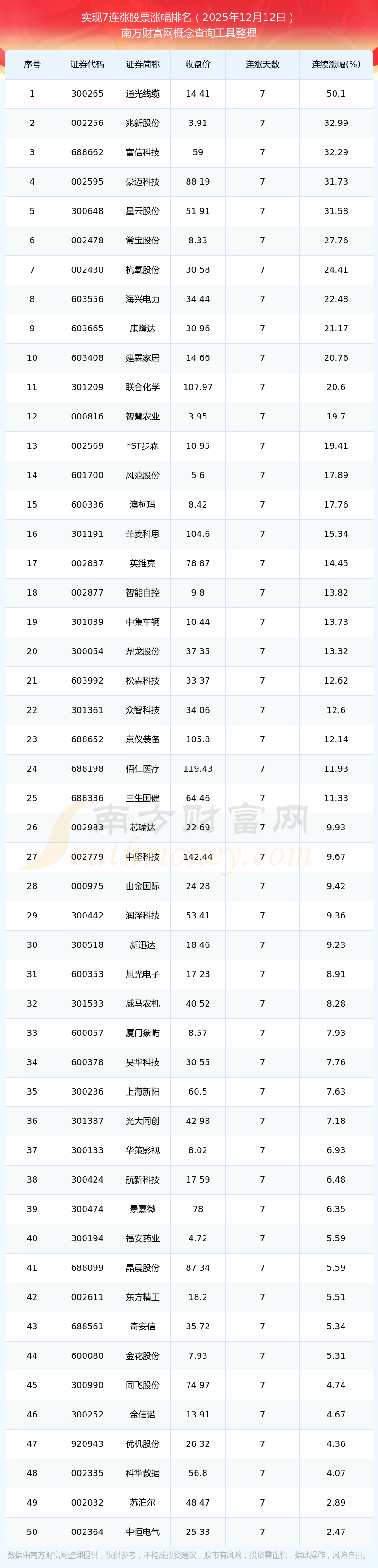 2025年12月12日實(shí)現(xiàn)7連漲股票漲幅排名